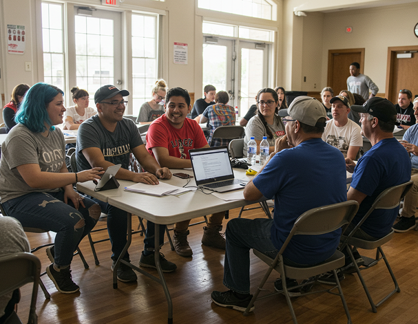 Two people viewing a laptop screen displaying a video conference grid with multiple professional participants.